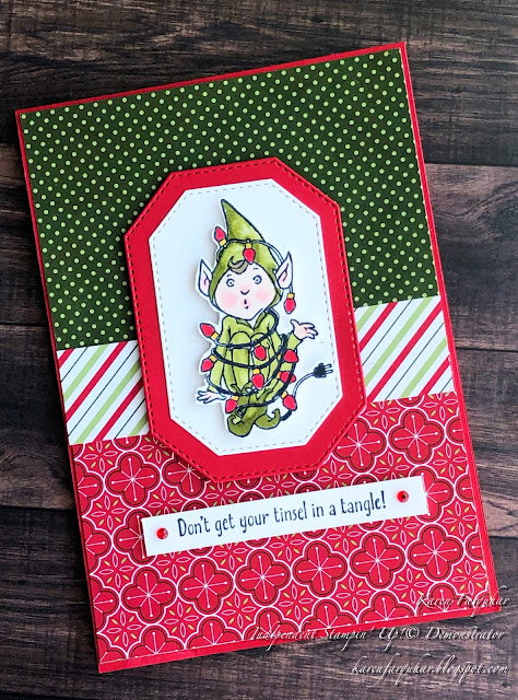 I have die cut a rectangle and positioned Santa in it's corner. The background to the card was sponged with Night of Navy and Tuxedo Black Memento then sprintz the card stock with water and Wink of Stella to represent the night sky.